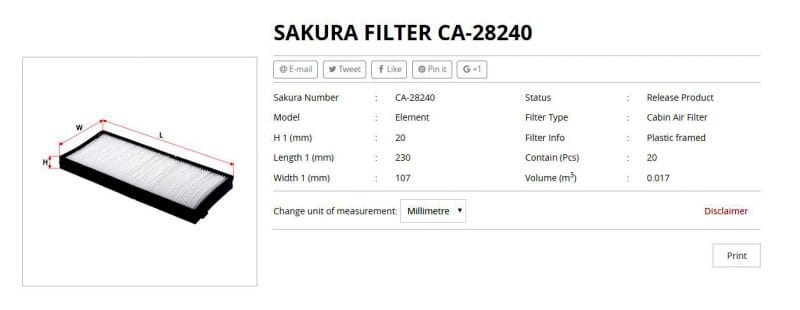 مشخصات ظاهری و اندازه فیلتر ساکورا مدل CA-28240